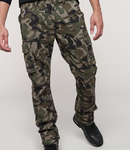 Twill fabric with peached finish. Belt loops. Zip fly with concealed button over. Two side pockets. Rear and two side leg pockets with tear release flaps. Specifically treated to appear aged.