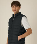 100% Recycled nylon. Men’s bodywarmer. Medium fit. Sleeveless. High collar. Reverse nylon zip at centre front. Zipped welt pockets with extra grosgrain puller. Elastic tape binding at the armhole. Fully quilted. Side panels for a better shape. Inside seams with binding finish. Bottom hem has an adjustable plastic stopper and elastic cord.